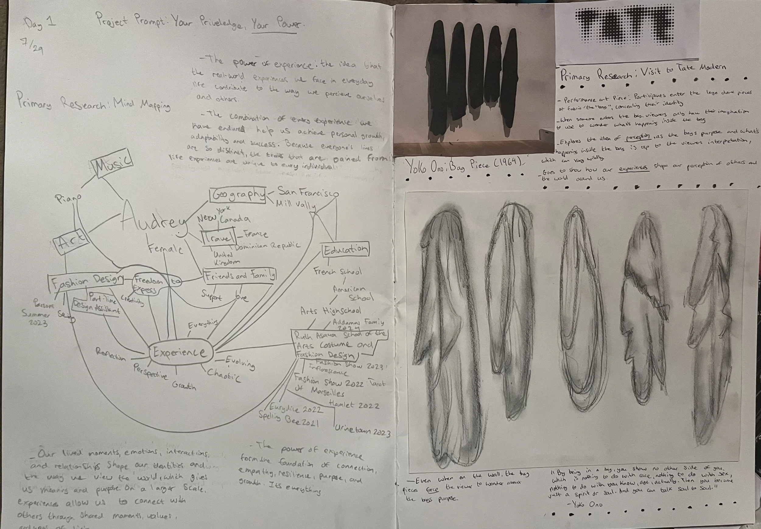 For this project I completed at Central Saint Martins Fashion Design and Draping Short Course, I (along with every other student) was instructed to interpret the phrase “Your privilege. Your power.” by creating a concept related to a privilege or power that we found the most important in life. I began by creating a mind-map of the core parts of my identity, and the privileges that are bound to them. While connecting the parts of my mind-map, I realized that every single aspect of my identity was connected to the way I approached and viewed life, my experience. Seeing this inspired me to base my concept/project on the power of experience: the idea that the real-world experiences we face in everyday life contribute to the way we perceive ourselves, others and the world. The power of experience forms the foundation for human connection, empathy, resilience, life purpose, and growth. To me, experience is everything.
